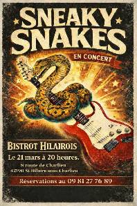Je joue avec mon groupe les sneaky snakes au bar Le Bistrot Hilairois le samedi 21 Mars a 20h . 8 route de charlieu a saint hilaire sous charlieu .